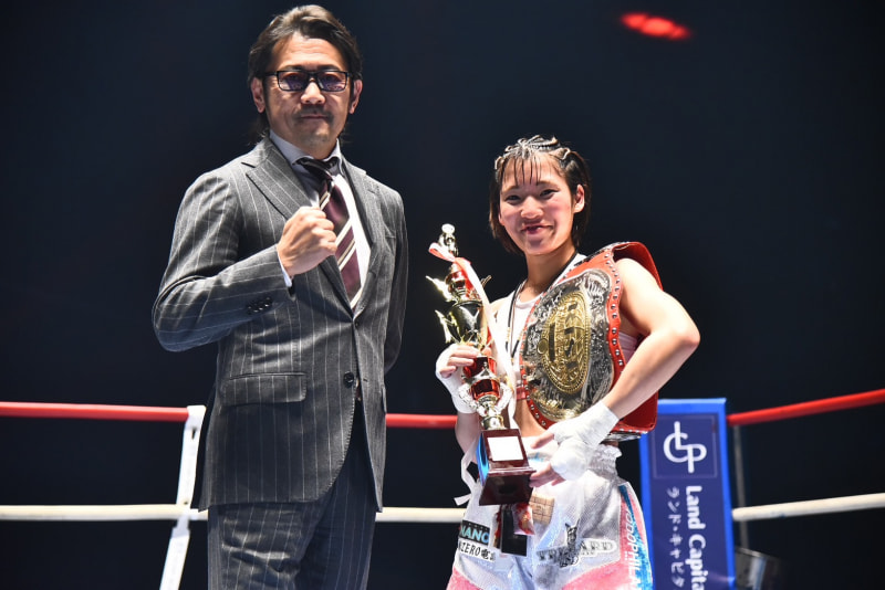 勝利した宮﨑(右)と、K-1カルロス菊田プロデューサー