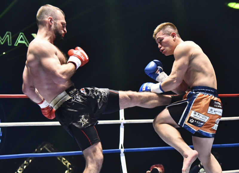アキモフ(左)は蹴りの距離で攻める