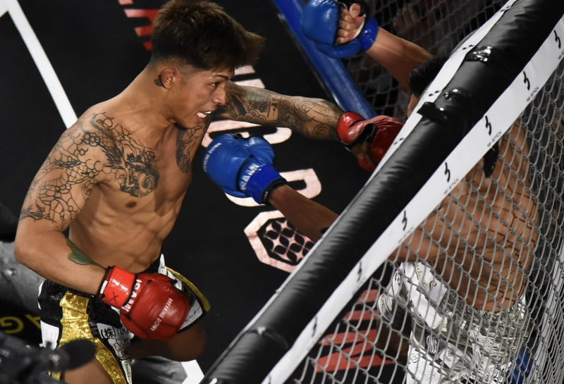 外枦保が左のパンチを叩き込む
