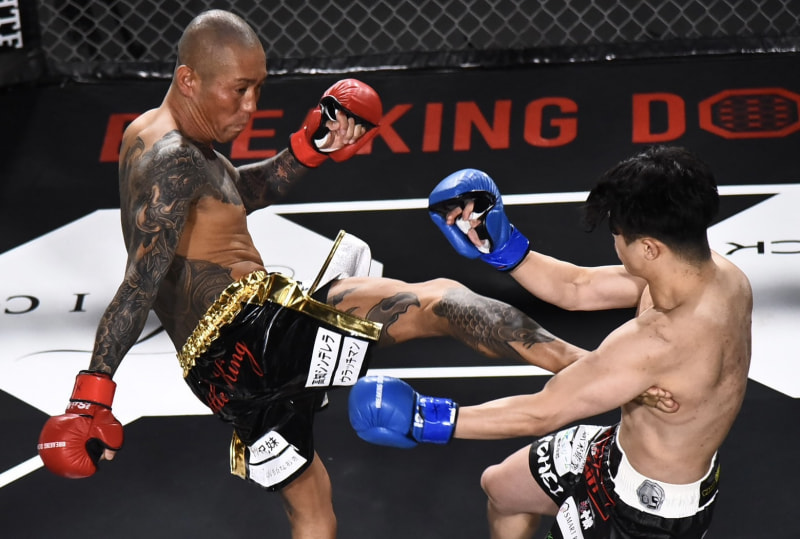 村田(左)が西島の脇腹にキックを蹴り込む