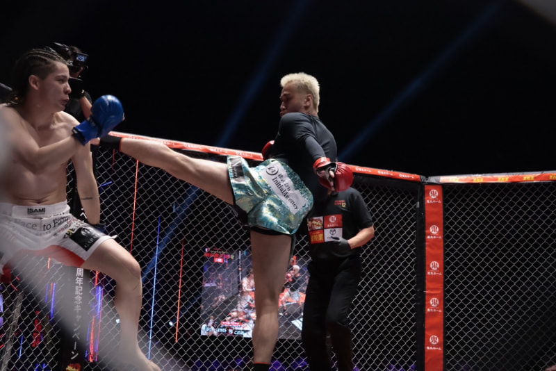 ハイキックで攻めるこめお