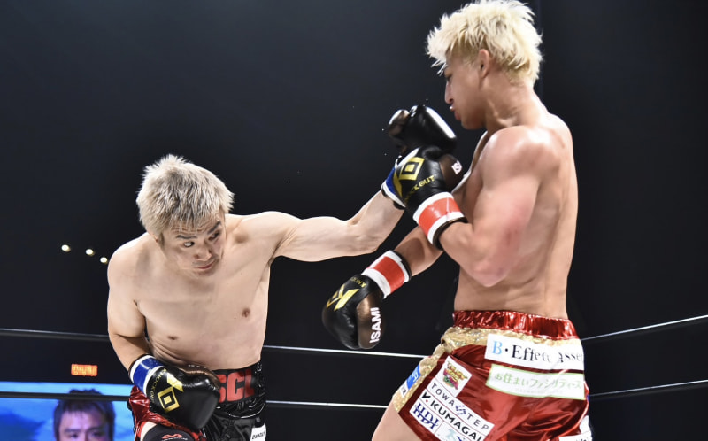 五味がダッキングしながら左フックを見せる