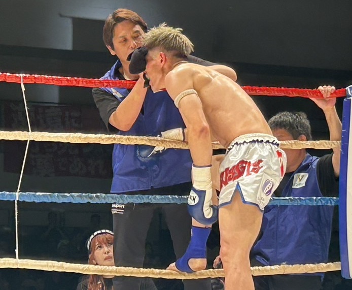 ヒジで顔をカットした梅田がチェックを受ける