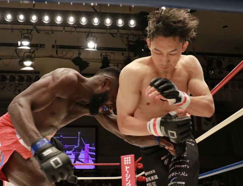 オープンフィンガーグローブでパンチを放つ都木(右)
