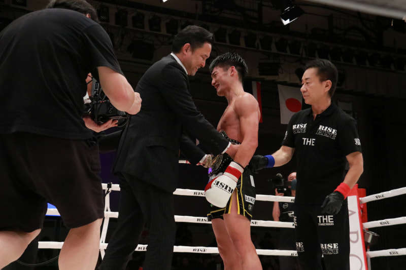 伊藤代表にベルトを巻かれて笑顔の大﨑
