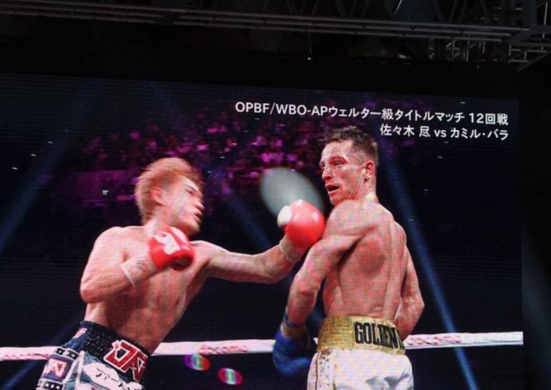 KOの飛び込んでの左フック(会場の大型ビジョンより)