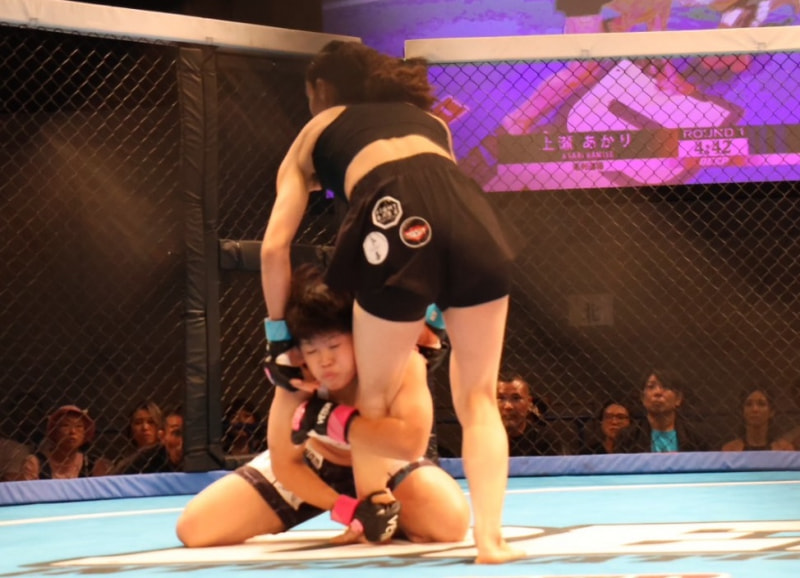 低空のシングルレッグからテイクダウンする上瀬