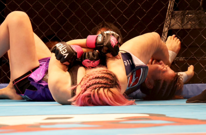 腕十字がガッチリ極まり、苦しむ桐生(右)