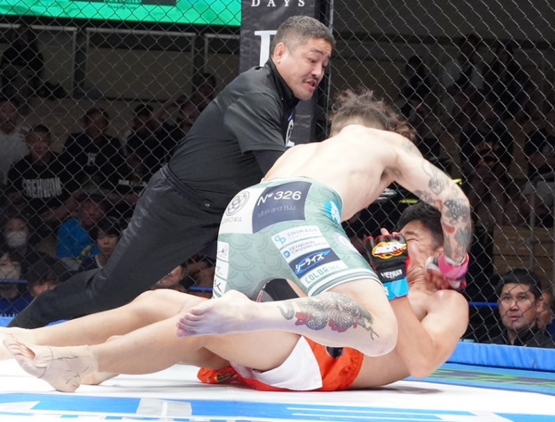 パウンドを打ち込む福田、レフェリーが止めた