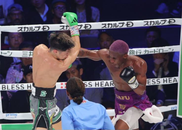 田中のアッパーにカフの右フックがヒット!これでダウンを奪う