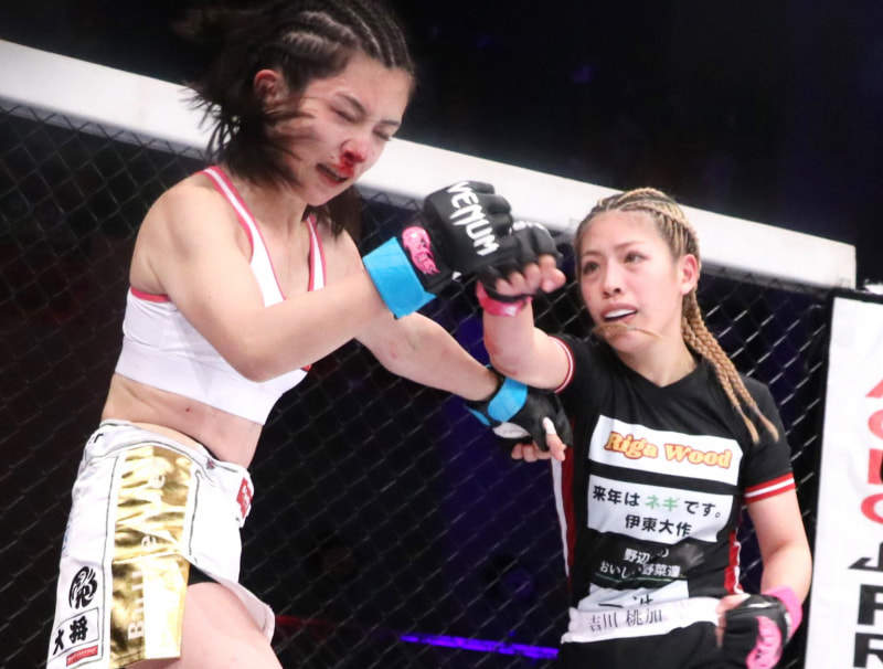 あきぴ(左)にパンチをヒットさせた吉川(右)