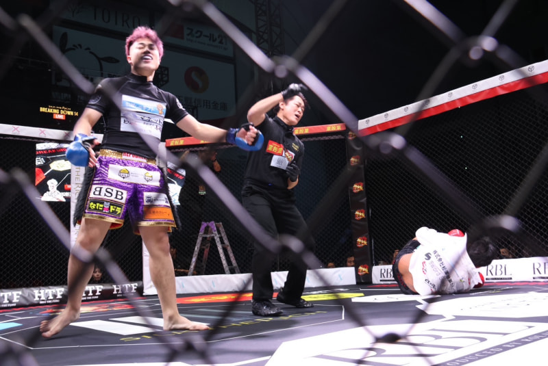 バン仲村(右)をダウンさせる10人ニキ(左)