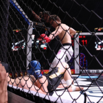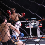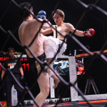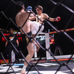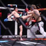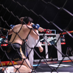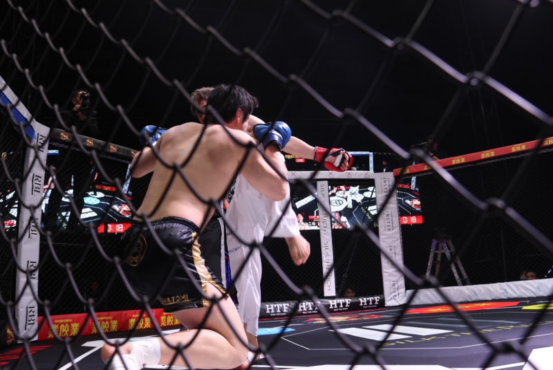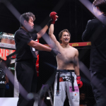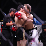 大野が膝蹴りを入れ小宮山が崩れる瞬間