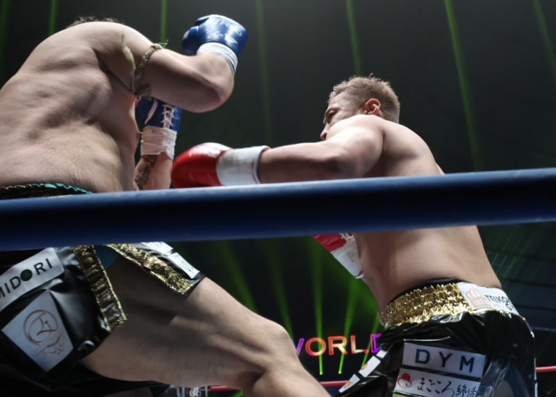 強烈なパンチを放つ谷川(右)
