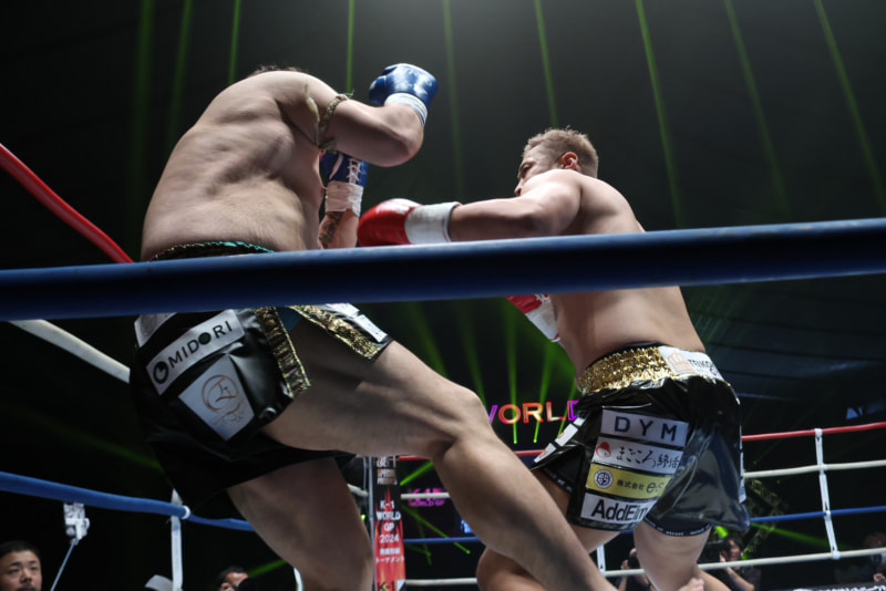 左のパンチを繰り出す谷川(右)