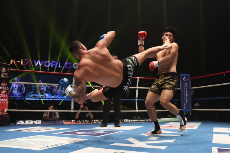 ルイ(右)の顔面にキックを放つファラオーニ(左)