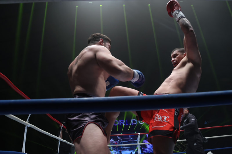 ブルーデネル(左)にマチャド(右)がキックを当てる