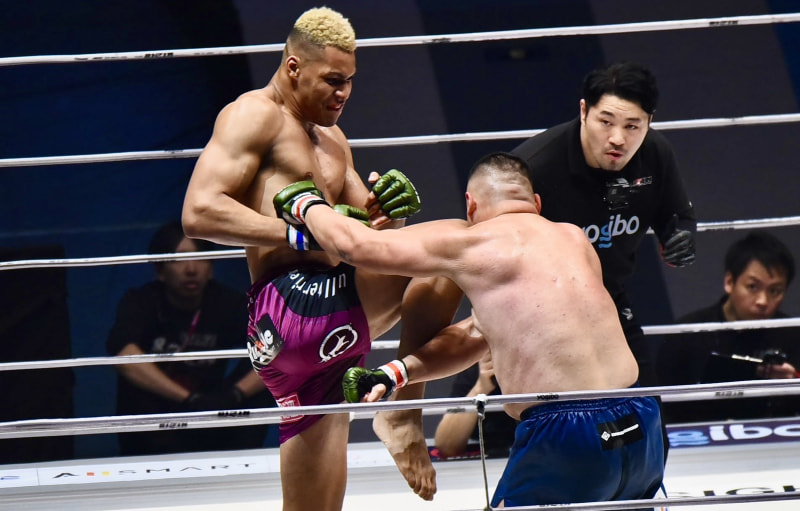 エドポロキングのヒザが貴賢神の顔にヒット