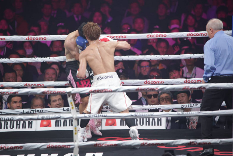 ロープを背にするキムに、井上が…