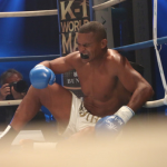 カーフキックを効かせた後、フックがヒット!