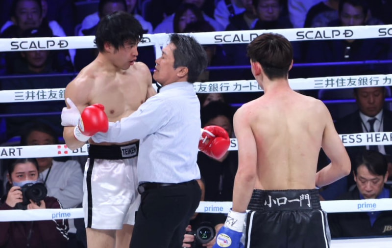赤井英五郎(左)が盛合竜也(右)にTKO負け!レフェリーストップの瞬間
