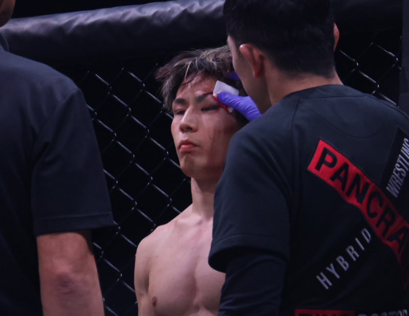 右眉上から流血、手当てを受ける黒澤