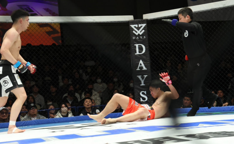 1R終了間際、平松(左)が瀧澤(右)をKO!