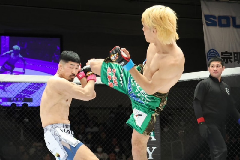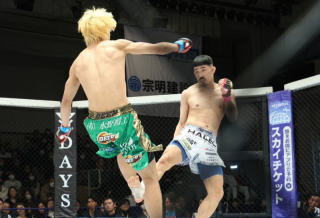 1R、両者サウスポーで向き合う。上背でまさる水野が右ジャブを伸ばすが、芦田はそこに左クロスを合わせ、ローキックでもとらえる。左パンチを当てていた芦田だが、水野が飛びヒザからの右フックでダウンを奪い、組みついて来る芦田をパウンドで攻める。芦田はタックルに形を変え組みつくが、水野はそこに鉄槌を連打。ダメージを見てレフェリーが試合を止めた。