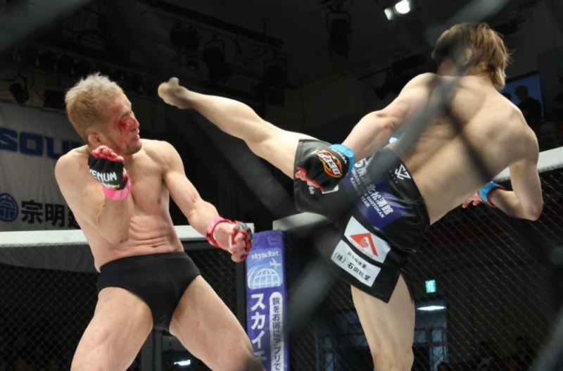 流血する中村にハイキックを繰り出す五明