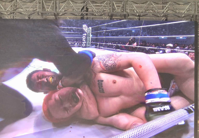 チョークで相手がタップ!前田が一本勝ち!(会場の大型ビジョンより)