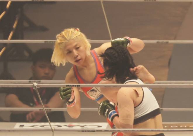 ハイキックしながらパンチを打つ万智