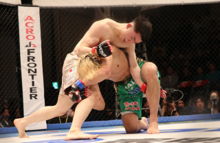 1R、水野がタックルを仕掛けると、海飛はケージを背にして立ち上がる。水野はヒザ蹴りを顔面へ、グラウンドでは上から押さえ込む。そのままバックを狙う水野だが、海飛は正対して離れる。水野は左右フックからタックルを仕掛け、ケージ際から後ろに崩して、テイクダウンを奪う。