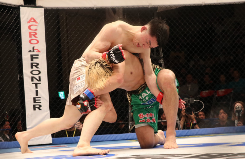 海飛がパウンド、ヒジ打ち!水野を流血させる