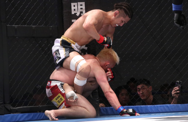 1R、緊張感のある攻防から、お互いに随所でパンチを交換する。ケンシロウがケージ際から、川島を崩してマウントポジションへ、パウンド連打、後ろを向いたところでバックチョーク!残り15秒ほどだったが、何とか川島は外して耐えた。