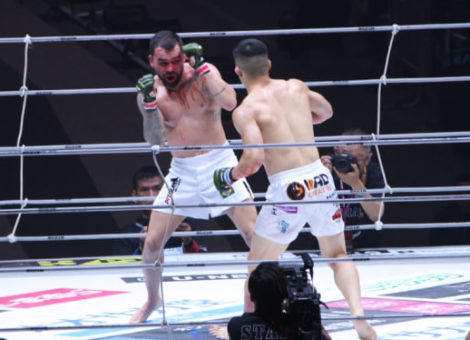 野村のパンチ連打にパトリッキーの顔面が鮮血に染まる