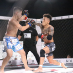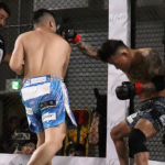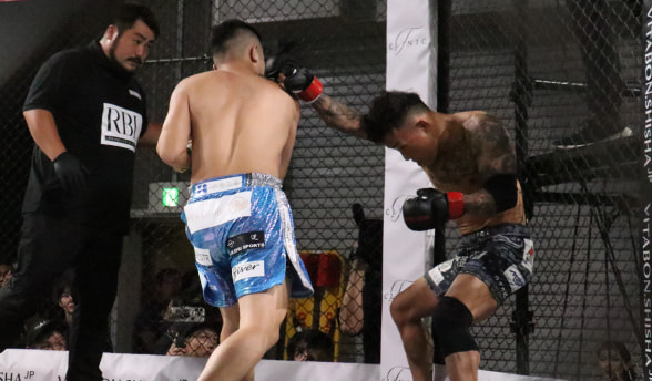 スピードある左右フックを放った秋元