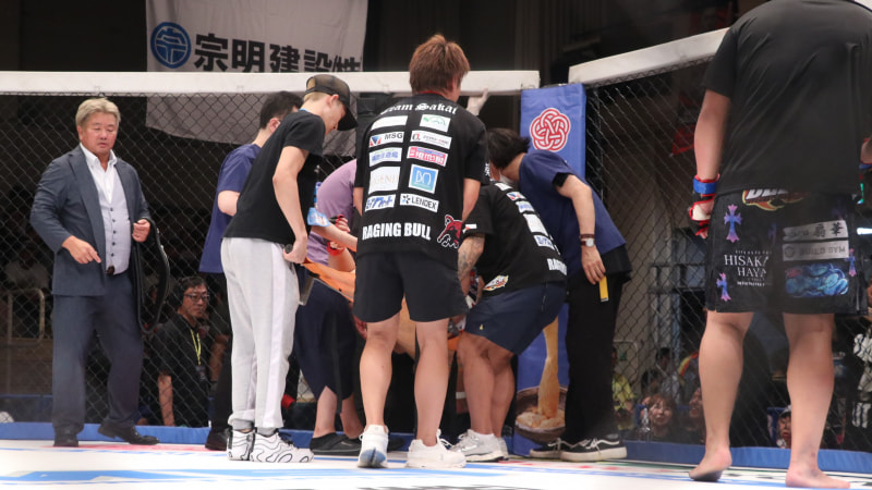 担架で運ばれる酒井