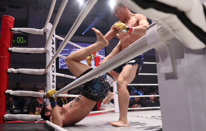 石田(左)が高塩(右)を蹴り上げる