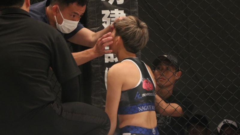 蹴りが顔面に入り、チェックを受けるSAAYA