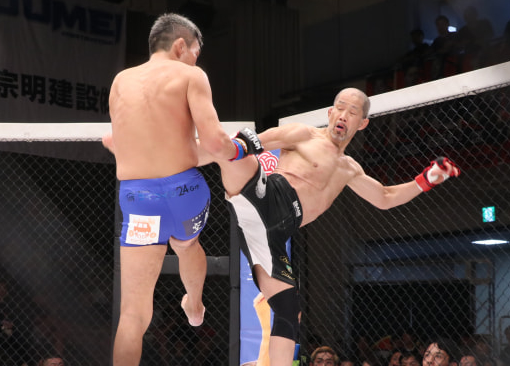 郷野がボディにキックを放つ