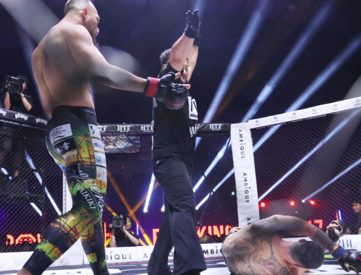 謙次郎が崩れ落ち失神、KO勝利へ