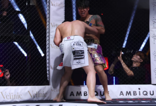 山本が再びレバーからパンチ連打