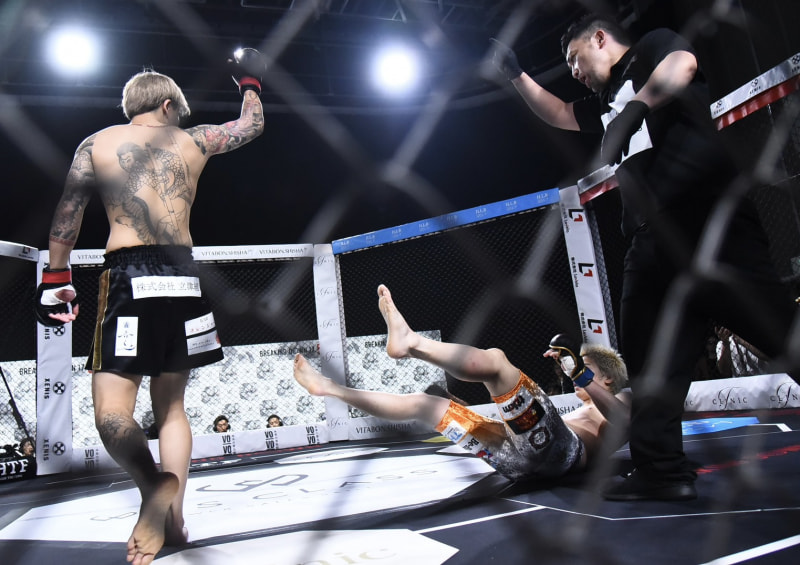 一進一退の展開が続くが、ラスト10秒、龍志がジャンプしての右ローからの左ハイキックをヒット!竹見がダウンした。思いもかけぬ、突然の2段蹴りだ。