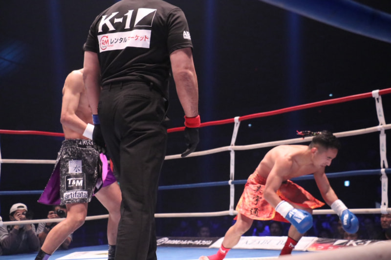 大久保(左)は立ち上がったユートン(右)に、またも三日月蹴り
