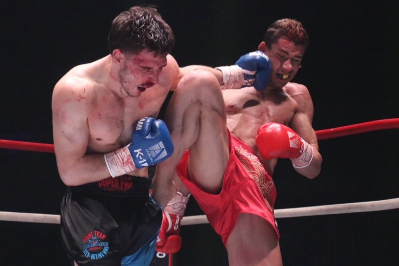 フェルドンクのパンチとストーヤンのヒザ蹴りが交差する