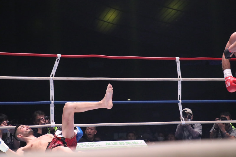 バッタリダウンするアイメリック、一撃KO勝利へ