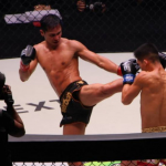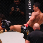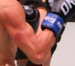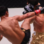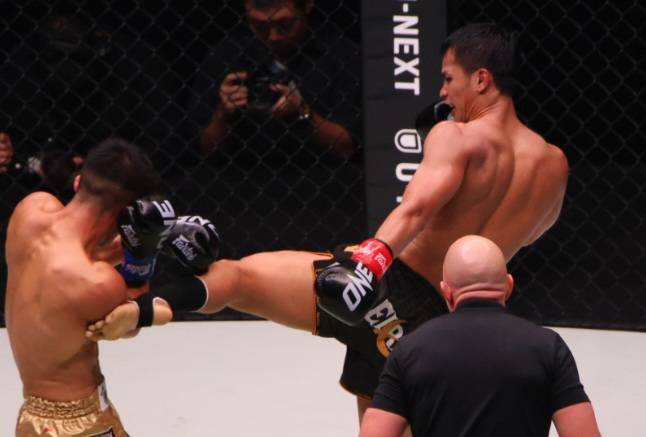 スーパーボンのミドルキックが野杁の腕にヒット!