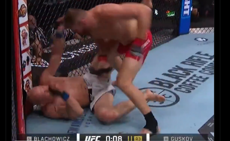 ブラホビッチが仰向けにダウンし、グスコフが飛び込んで鉄槌、ヒジ。ブラホビッチは下から左ヒールフックを仕掛けるも、グスコフはニヤリと笑って逃れ、ヒジを入れ続ける。ブラホビッチの顔面からは流血し、苦しい展開だ。