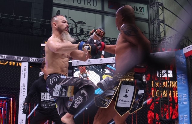 飛びヒザ蹴りを放つジェリオ