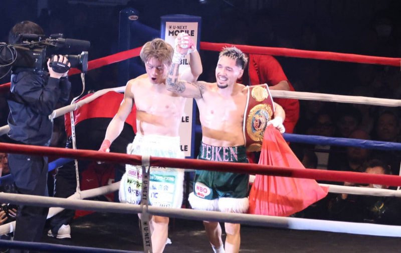 防衛成功したオラスクアガ(右)が桑原(左)の健闘を称える